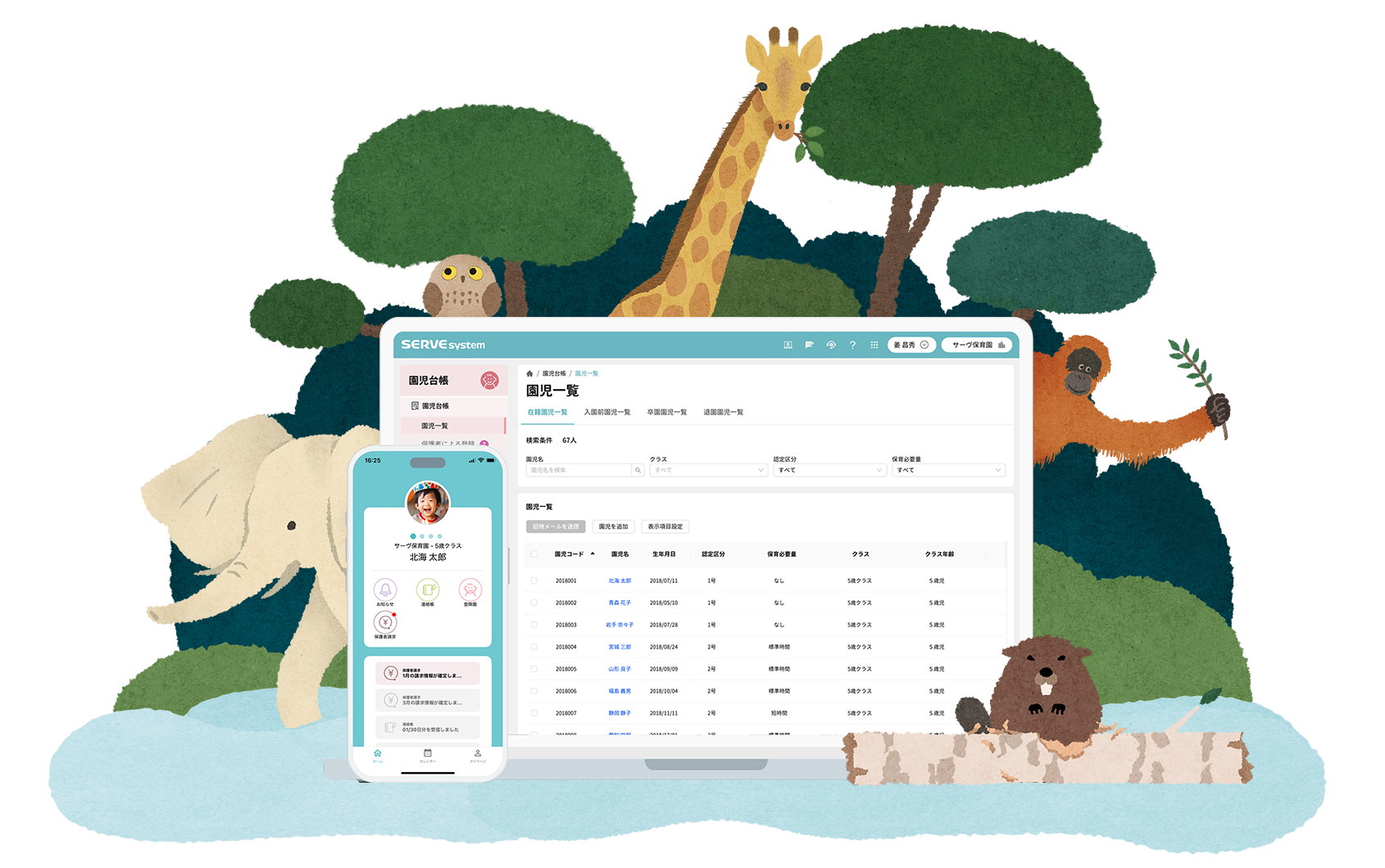 サーヴは登降園などの保育管理システムだけでなく、会計や給与、ホームページ、シフト管理といった
