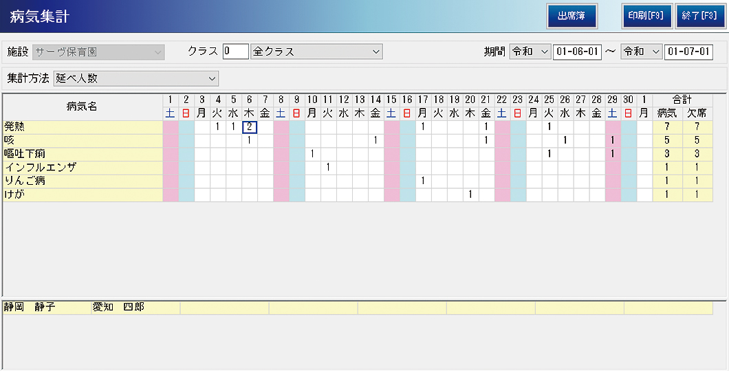 出席簿に病欠理由を登録すると、インフルエンザ疾患数などを月単位で一覧表示したり年単位で集計したりできます。