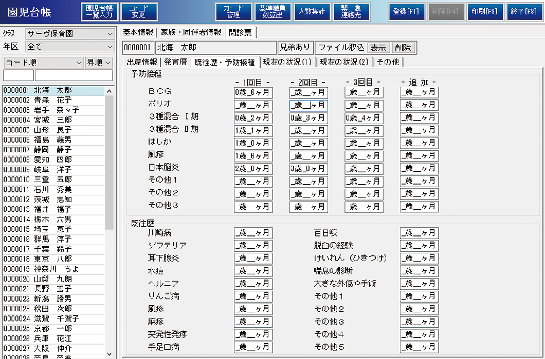 - タブを切り替えることによって「家族・同伴者情報」「問診票」の情報画面へ素早く移動。問診票では園児の既往歴や予防接種状況などを保存しておくことができます。