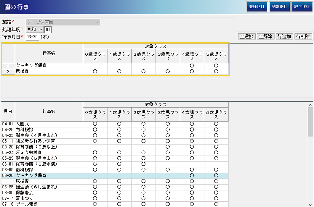 園の年間行事を登録しておくと、指導計画や日誌、個別記録の行事欄に自動的に表示することができます。
