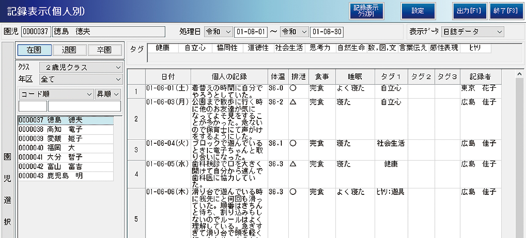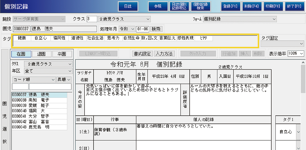 複数の日誌にまたがって記録された園児の情報は、[日誌・個別記録取込]ボタンから集約し、園児ごとの情報として保存できます。タグを使えば簡単に情報のフィルタリングが可能です。