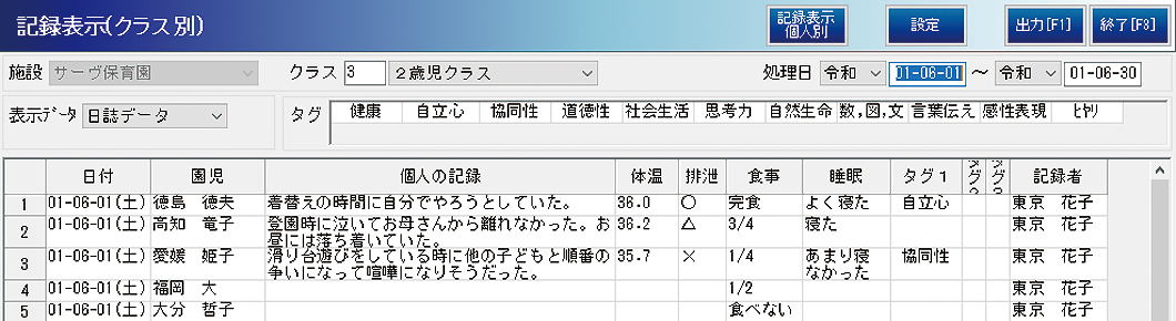 日誌や個別記録で入力したデータは、任意の期間で一覧表示したり、園児ごとやクラスごとにまとめて表示したりできます。設定済みのタグで、さらに情報を絞り込むことも可能です。保護者との面談資料としての活用や、園内の報告を効率的に行うための資料として活躍します。