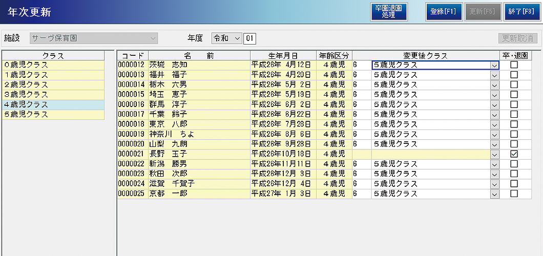 園児一覧を確認しながら、ひとつの画面で自動または手動で進級処理が行えます。複数のクラスがある場合も操作は簡単です。