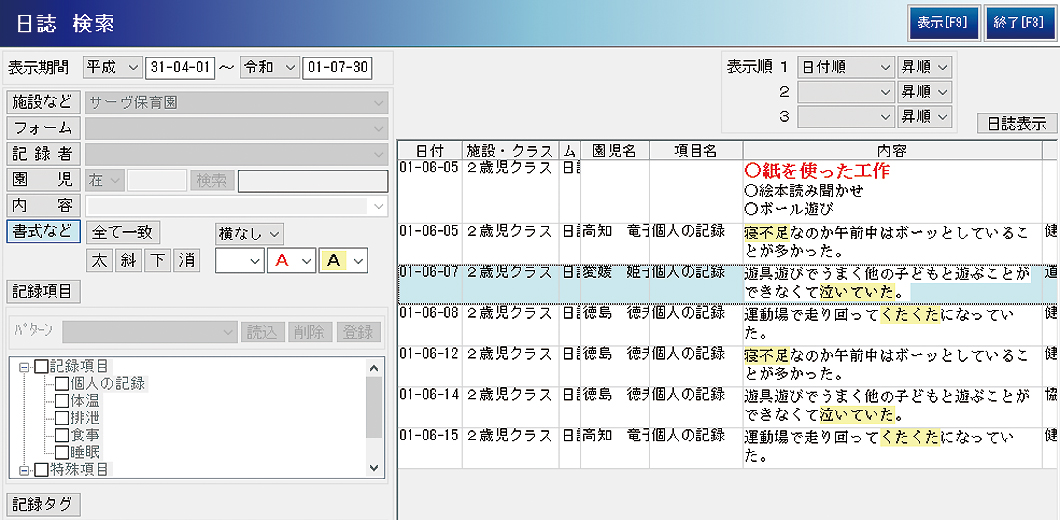 - 「健康」「自立心」などのタグ付けや「ヒヤリハットは赤」など書式のルールを定めておけば、のちにそのタグや書式で入力内容を検索可能。