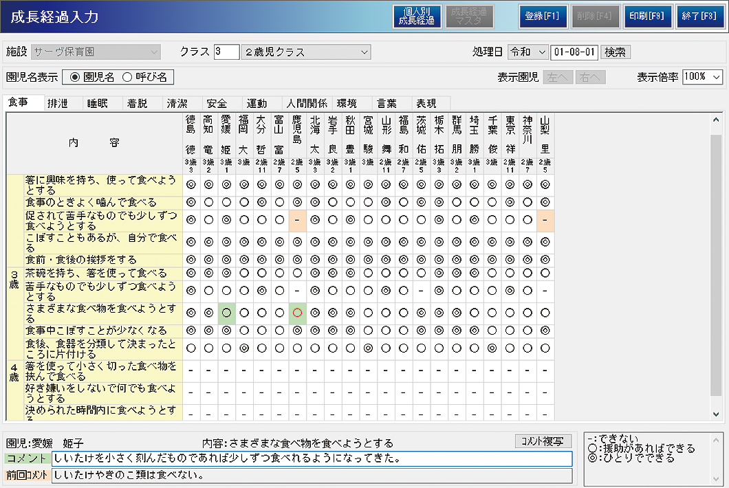 - 横軸に園児名、縦軸に成長過程を設定すれば、気がかりな項目を一目で確認できます。