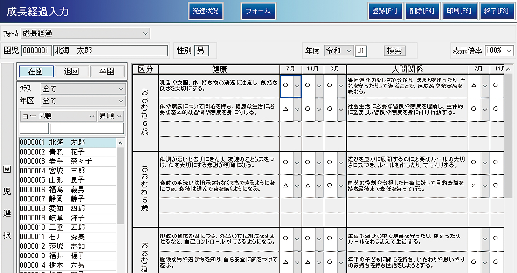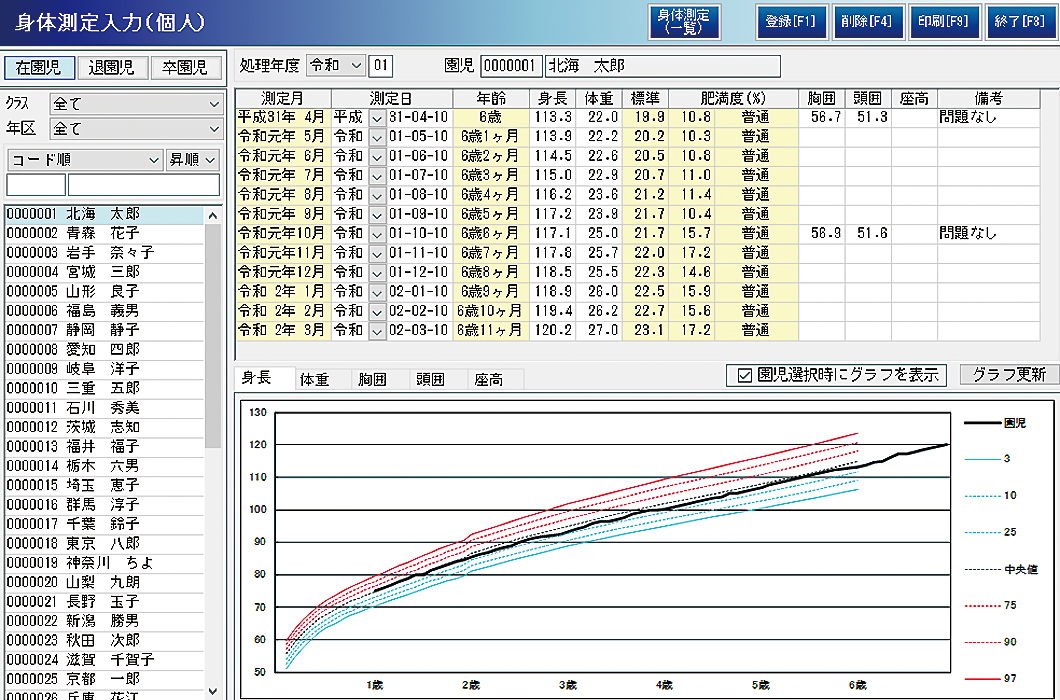 身体測定入力では園児全員の一覧と、個人別の表示・編集・印刷が可能です。クラスの平均値、肥満度の自動計算にも対応し、グラフ表示もできます。