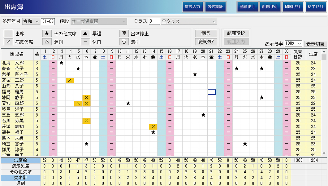 お休みや早退など、出席以外の情報を入力すれば出席簿が完成します。個人ごと、クラスごと、一日ごとなど、さまざまな単位で出席数や欠席数の集計が自動で行えます。