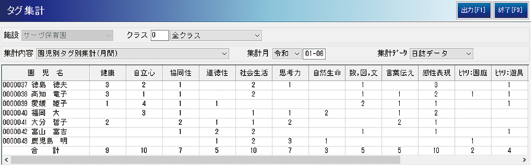 タグ付けしておいた内容は、園児別や日ごと、月ごとに集計できます。これを利用してヒヤリハットの場所を統計的に表示したり、日常の中で気づいた「幼児期の終わりまでに育ってほしい10の姿」に関連する様子をタグ付けしておき、お子さんの成長記録としてまとめて見れるようにするなどの活用が可能です。