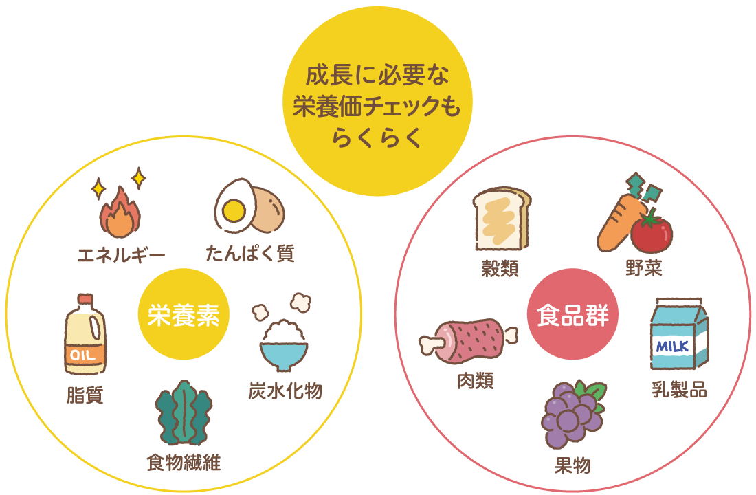 食事摂取基準をもとに園独自の栄養素別摂取目標量、食品群別摂取目標量を算出し設定が可能。指定した期間で栄養素や食品群摂取量を集計することにより、バランスのよい献立になっているかをチェック。
