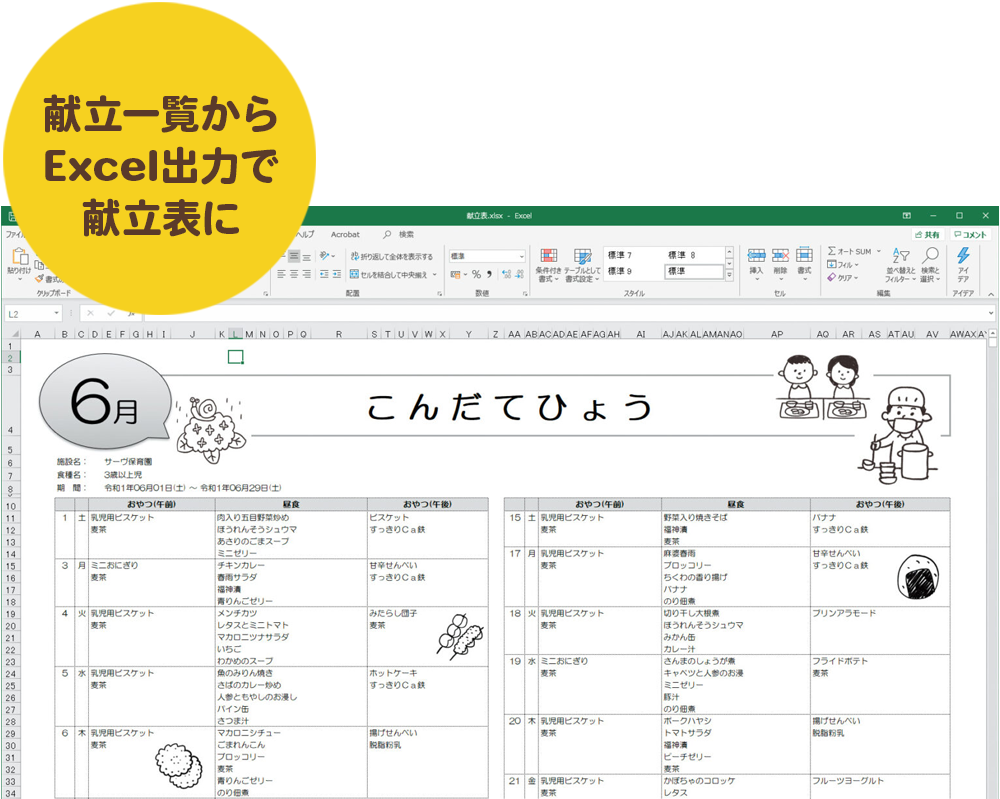 カレンダー上で料理を選ぶだけのかんたん献立登録。設定した目標値に栄養価の平均・充足率、アレルギーを確認しながら栄養素のバランスを満たした献立管理が可能。献立表から検食簿まで多様な帳票にも対応。