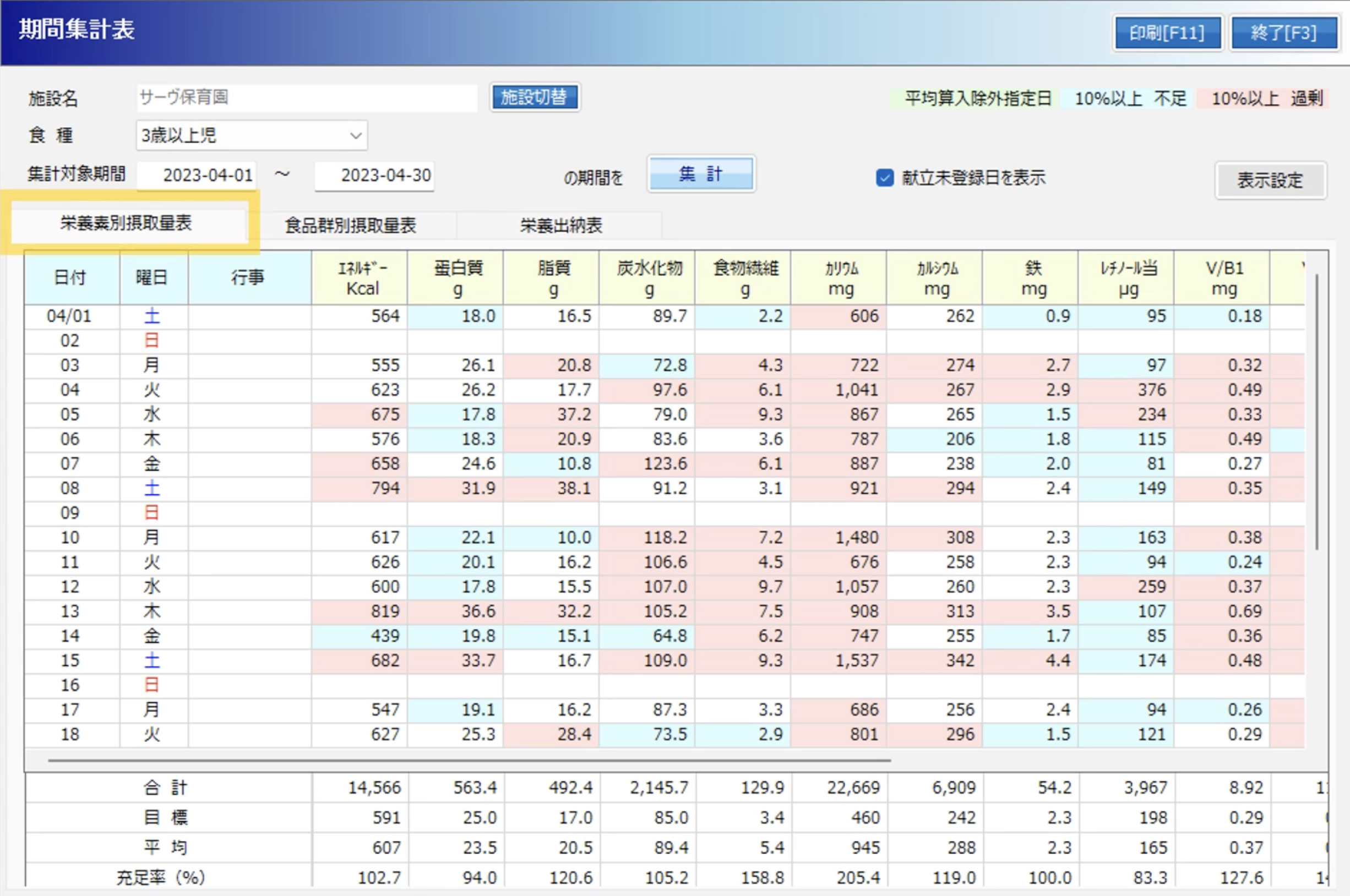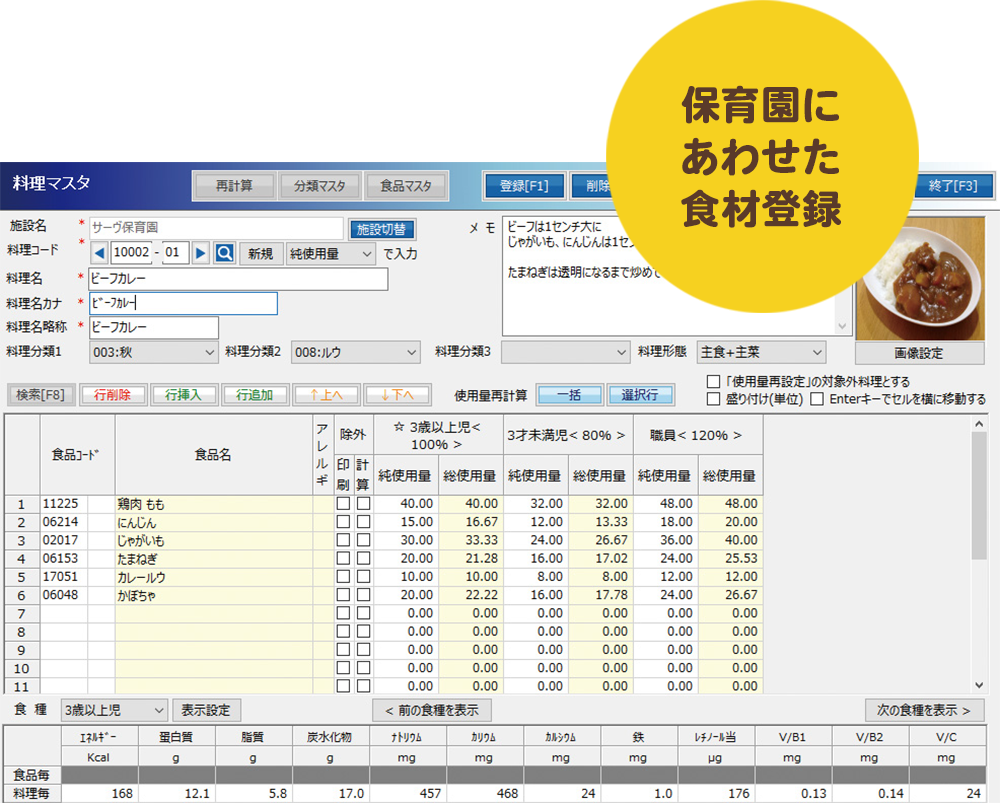 園児の年齢、性別、身長、体重から食事摂取基準に沿った栄養摂取目標量を算出。目標量に対して色分けで過不足を確認しながらバランスのよい献立を作成することができます。