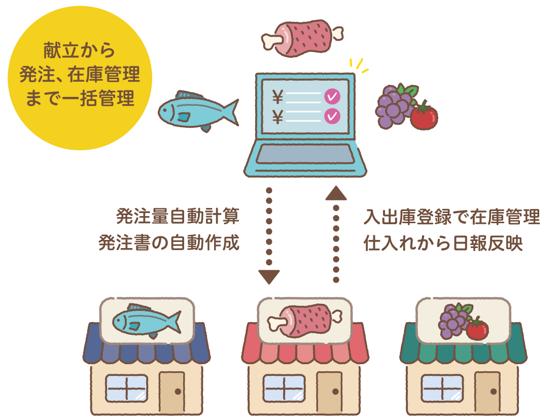 献立をもとに人数、必要食材の量と規格単位から発注量が自動計算されるので複雑な計算は不要。仕入内容は日報に反映され、仕入金額は食品の単価に反映。入出庫管理で在庫切れの心配なし。